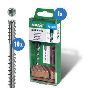 De SPAX RVS vlonderschroeven zijn geschikt voor alle soorten vlonderplanken. In deze combi deal zit ook een SPAX trappenboor.