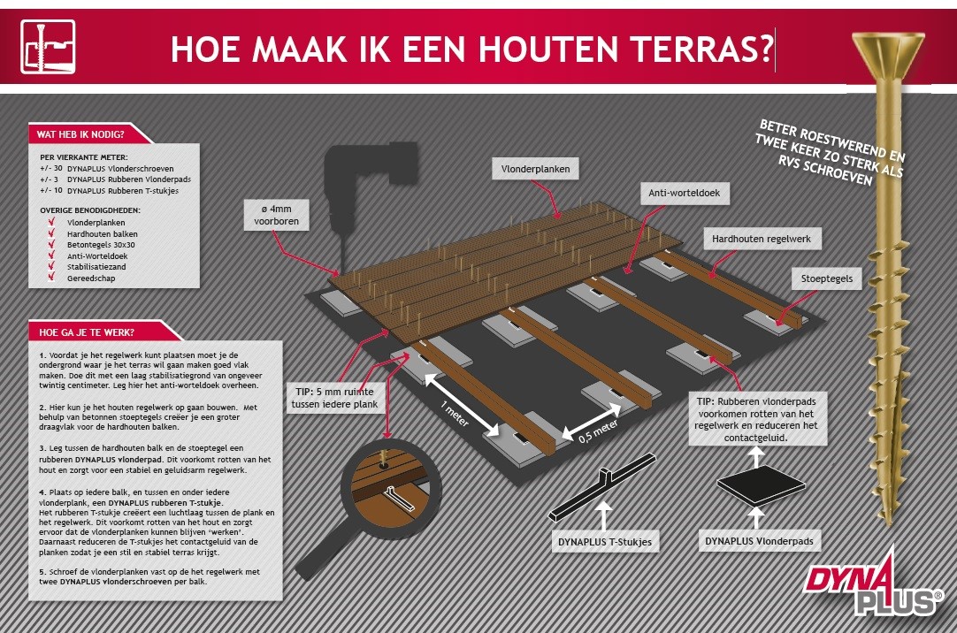 Wij snappen heel goed dat vandaag de dag alles draait om snelheid en vaak haast, daarom vinden wij het ook zeer belangrijk om zo snel als mogelijk te leveren, daarom zijn wij ingericht om binnen 24 uur te leveren, onze voorraad is zeer ruim. Vandaag bedenkt u hoe maak ik een houten vlonder, morgen maakt u uw houten vlonder, daarom koopt u bij Schroeven Online. En twijfel je over je bouwplan of dat je wel de juiste schroeven in je winkelmand hebt? Via de bekende kanalen kun je ons je vraag stellen over schroeven of over het bevestigen van vlonderplanken. Hieronder een handig stappenplan van Dynaplus over hoe je aan de slag gaat met het aanleggen van een vlonder.