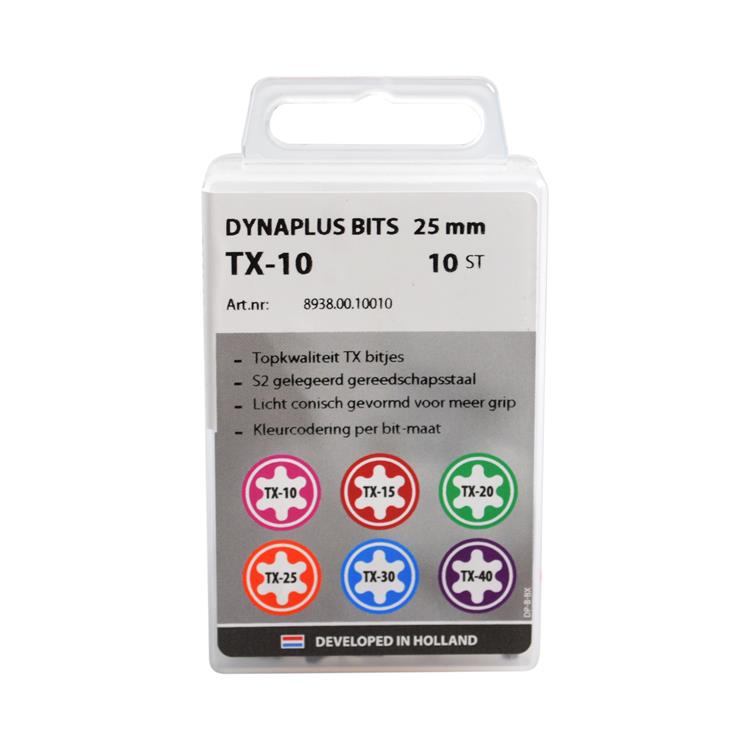 Dynaplus torx (TX) schroefbits van professionele kwaliteit. Passend op alle soorten torx schroeven. De Dynaplus schroefbits zijn licht conisch gevormd voor een stabiele passing op de schroeven. Deze schroefbits zijn gemaakt van hoogwaardig gehad S2 staal. Let op kies de juiste maat torx schroefbit bij de juiste torx schroeven. Deze schroefbit is geschikt voor T10 torx schroeven.