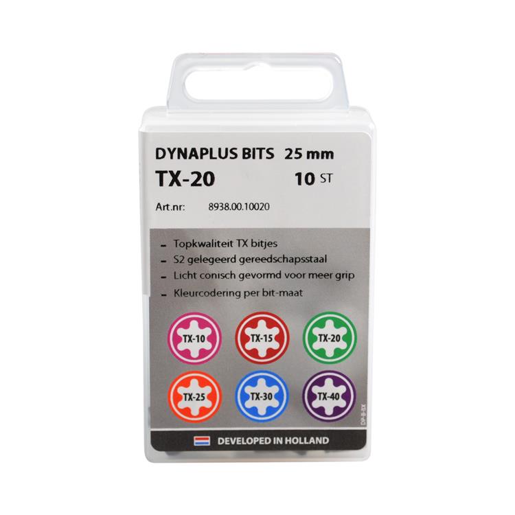 Dynaplus torx (TX) schroefbits van professionele kwaliteit. Passend op alle soorten torx schroeven. De Dynaplus schroefbits zijn licht conisch gevormd voor een stabiele passing op de schroeven. Deze schroefbits zijn gemaakt van hoogwaardig gehad S2 staal. Let op kies de juiste maat torx schroefbit bij de juiste torx schroeven. Deze schroefbit is geschikt voor T20 torx schroeven.