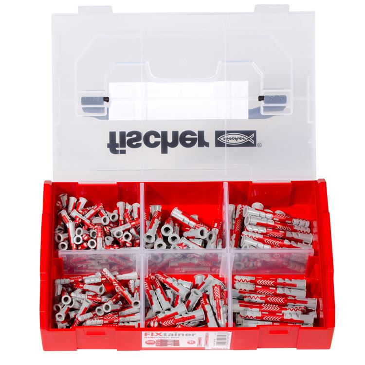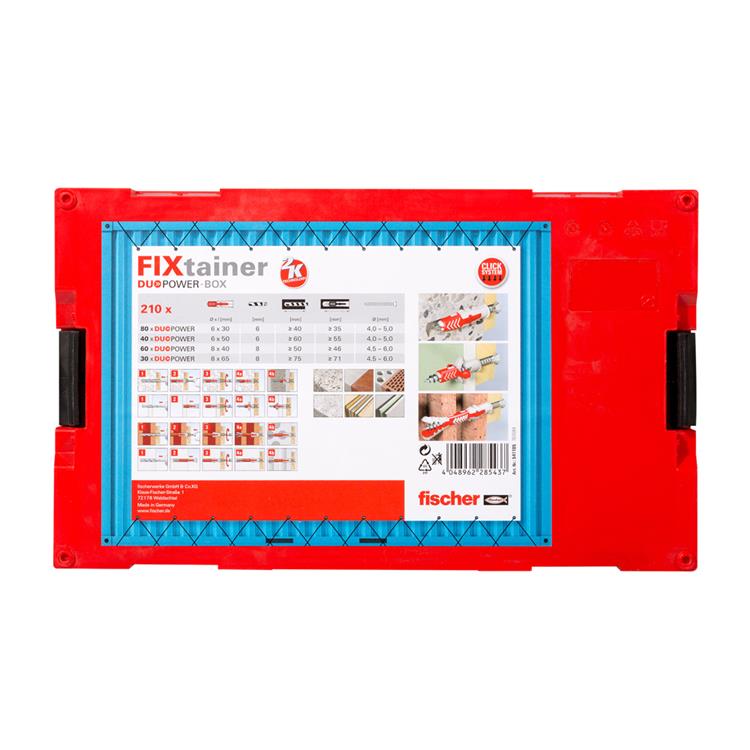 Fischer FIXtainer stapelbox. Fischer DUOPOWER pluggen zijn de allernieuwste pluggen van Fischer. Fischer DUOPOWER pluggen zijn te gebruiken voor iedere bevestiging. Deze Duopower FIXtainer box is gevuld met: