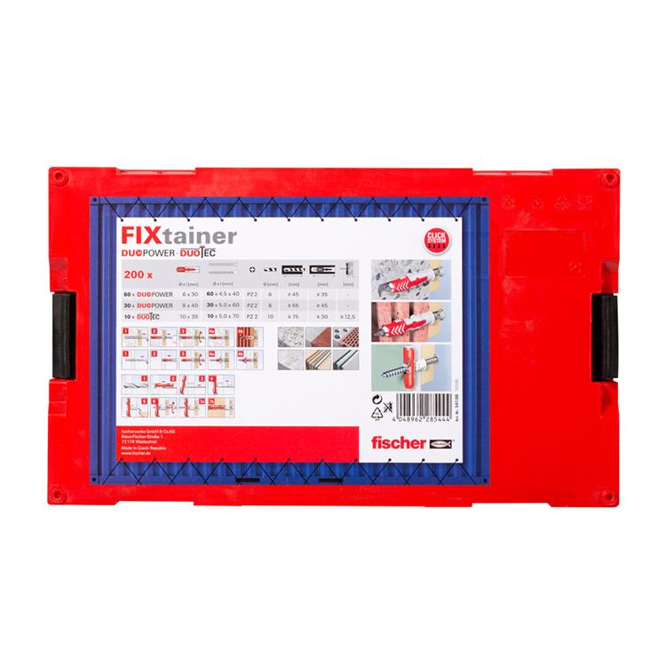 Fischer FIXtainer stapelbox. Fischer DUOPOWER pluggen + Duotec pluggen zijn de allernieuwste pluggen van Fischer. Fischer DUOPOWER pluggen zijn te gebruiken voor iedere bevestiging. Deze Duopower FIXtainer box is gevuld met: