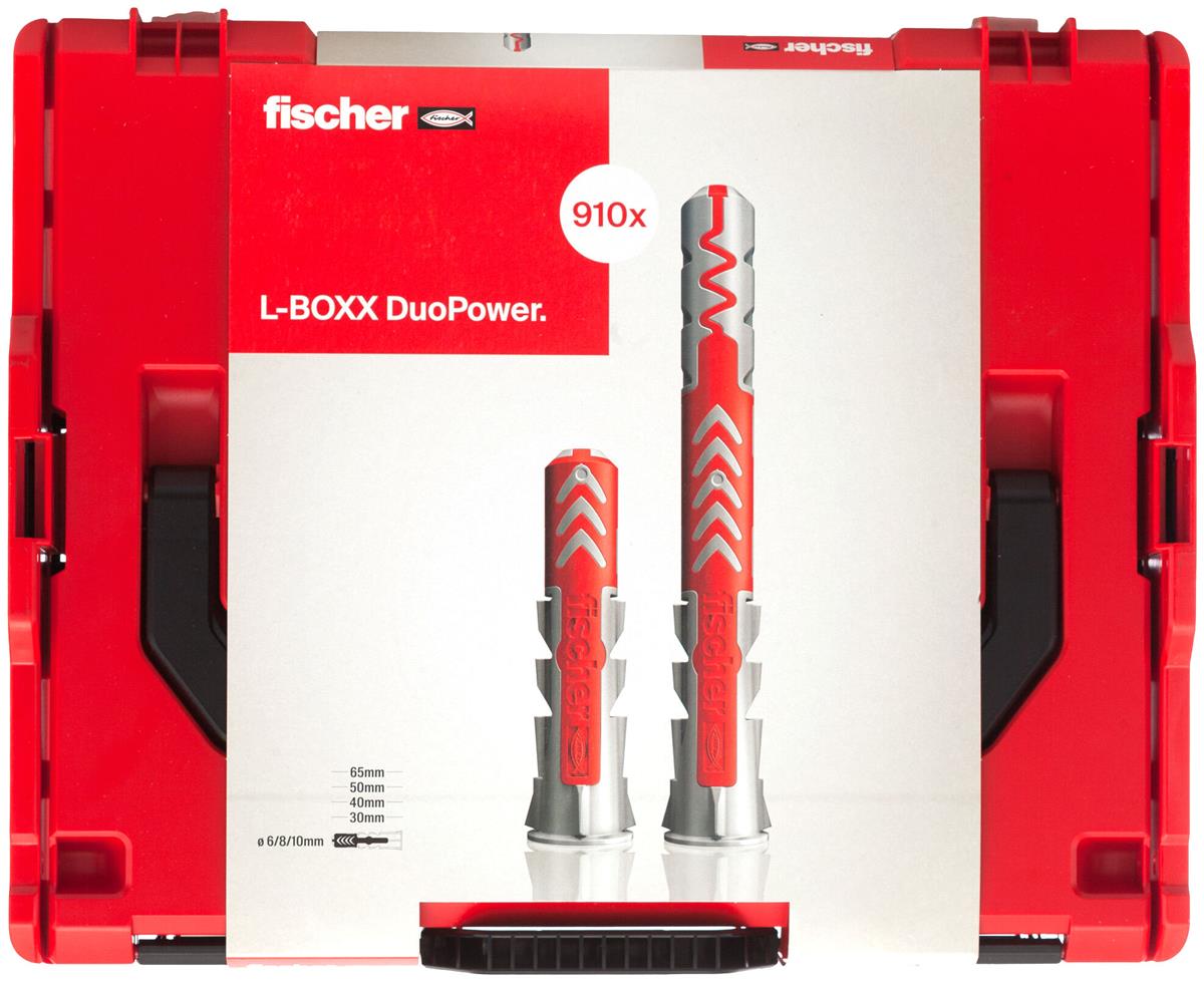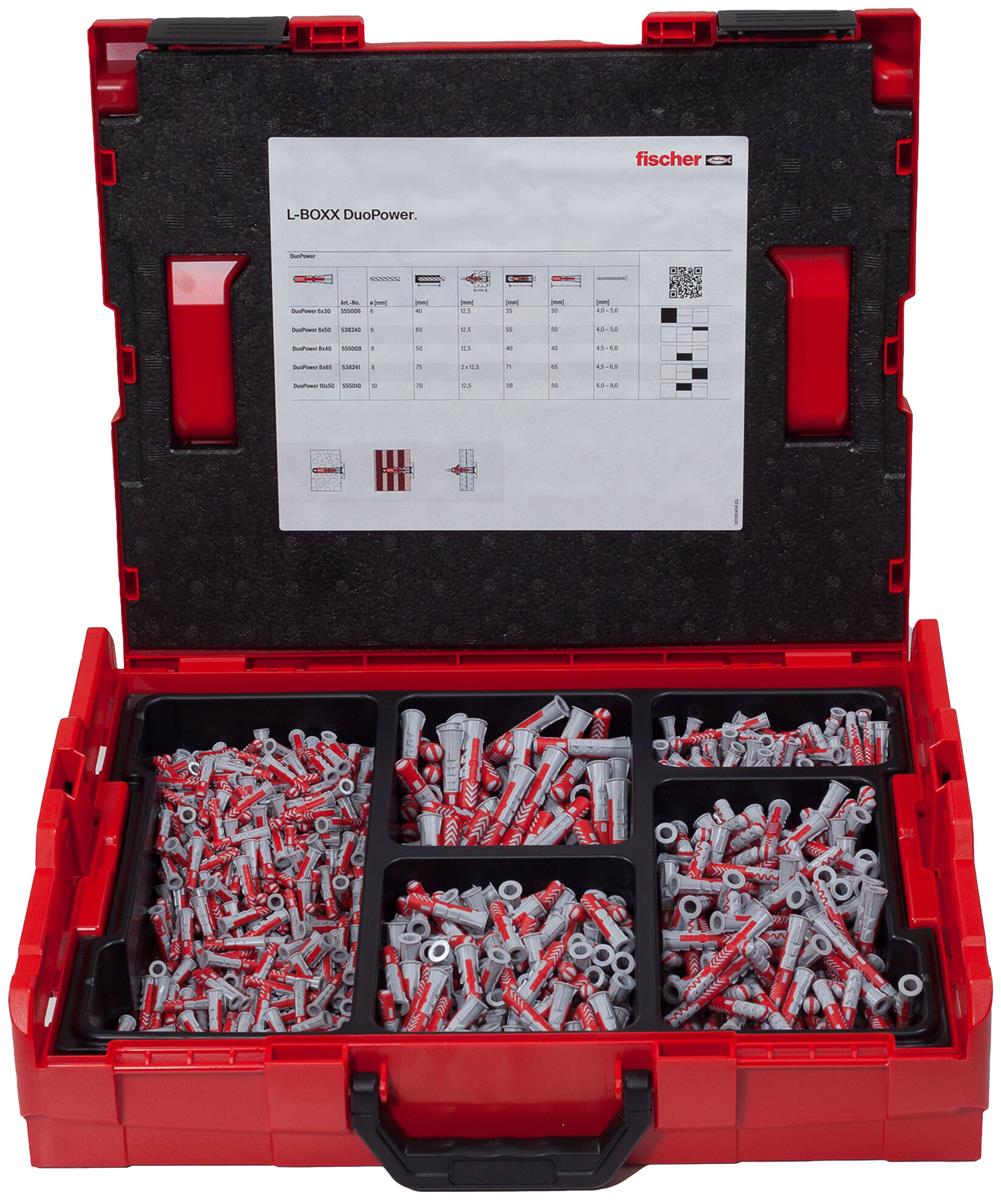 De praktische Fischer L-BOXX is gevuld met 910 DuoPower pluggen in verschillende maten. De Fischer DuoPower biedt door zijn 2 componenten zeer hoge belastingswaarden: afhankelijk van de bevestigingsondergrond, bepaalt de plug zelf de beste manier van werking; spreiden, vouwen of knopen. Deze Fischer Duopower L-BOXX bevat: