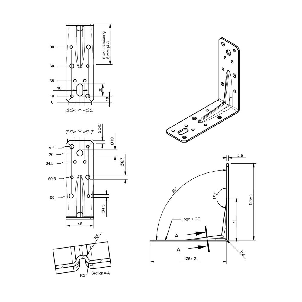 Verzinkt hoekanker van 125x125 mm met rilprofiel voor verhoogde stevigheid. De langere 125 x 125 mm variant is bestemd voor constructieve toepassingen en het verbinden van dikke houtpakketten waar maximale uittrekweerstand essentieel is.