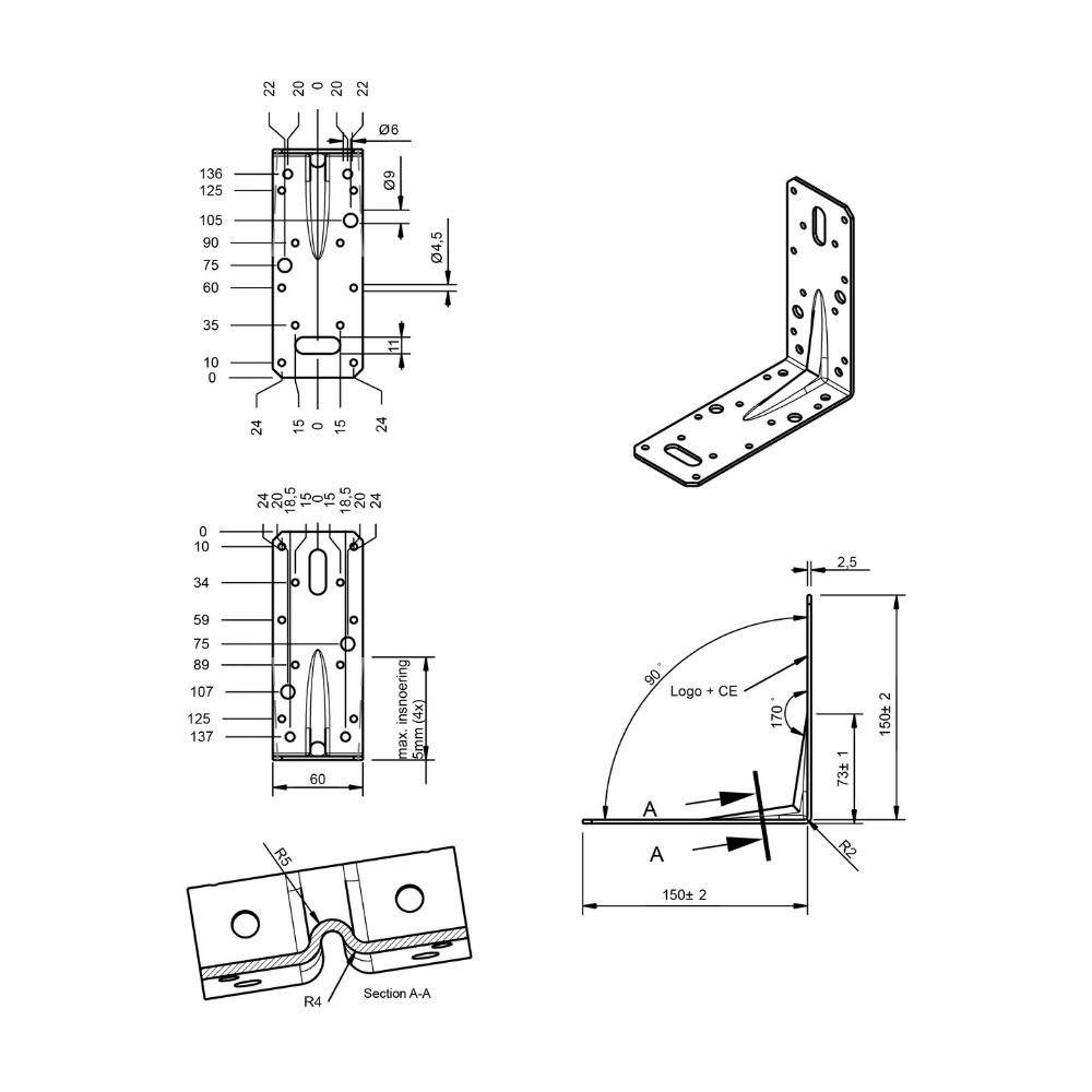 Hoekanker Ril - 150 x 150 x 60 x 2.5 mm - Zwart