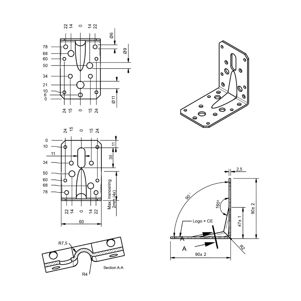 Verzinkt hoekanker van 90x90 mm met rilprofiel voor stevige hoeken. De 90 x 90 mm uitvoering is geschikt voor zwaardere verbindingen en constructief houtwerk waar meer verankering in het materiaal vereist is.