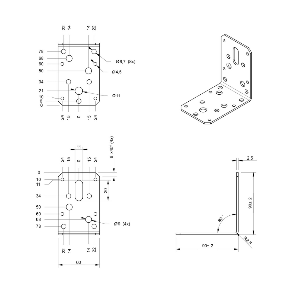 Zwart afgewerkt hoekanker van 90x90 mm, ideaal voor decoratieve projecten. De 90 x 90 mm uitvoering is geschikt voor zwaardere verbindingen en constructief houtwerk waar meer verankering in het materiaal vereist is.