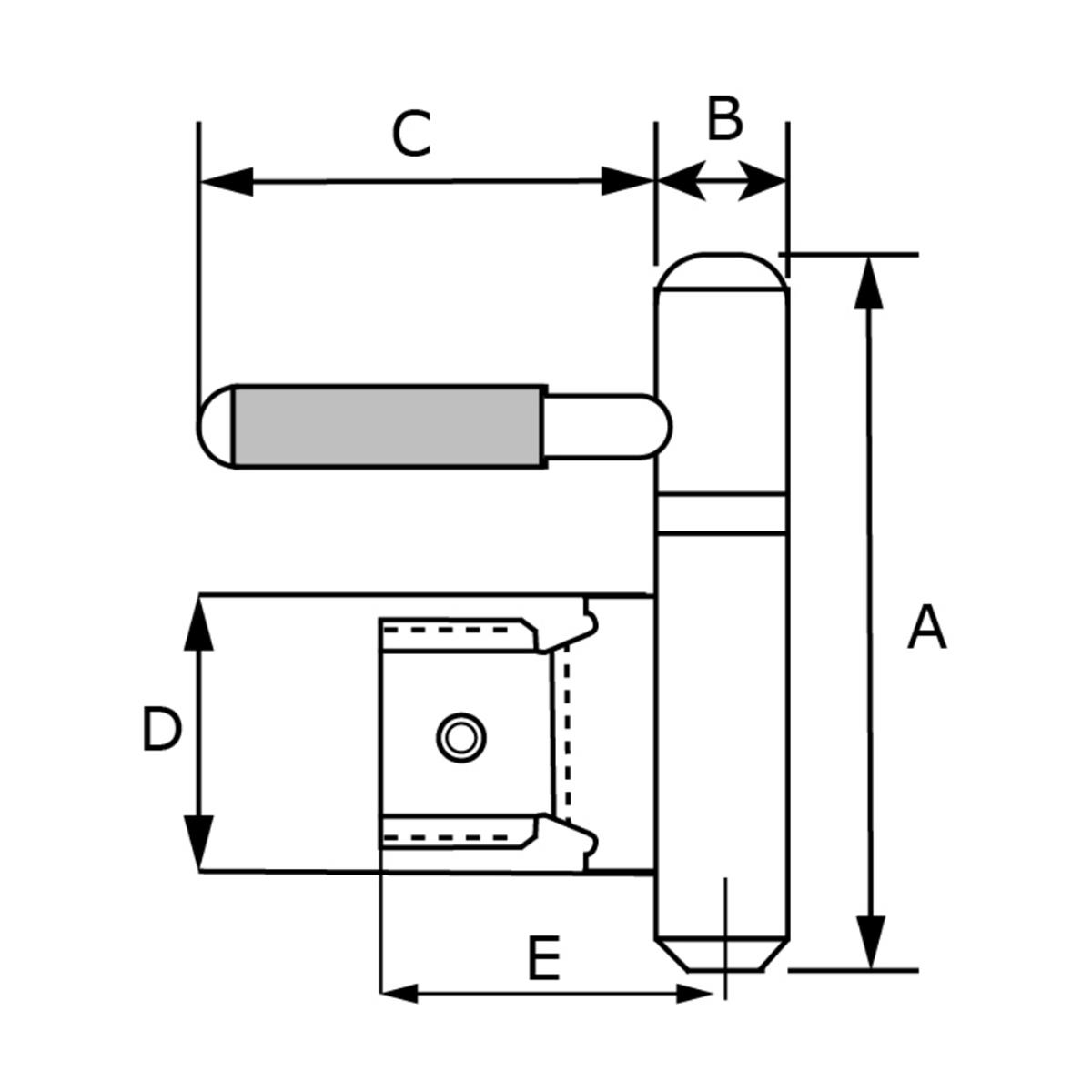Dit scharnier met rechte hoeken van A = 78 mm, B = 14 mm, C = 50 mm, D = 34 mm en E = 33 mm. is een robuuste keuze voor het bevestigen van deuren, luiken of poorten. De uitvoering met vaste pen maakt het mogelijk om het scharnier eenvoudig vast te bevestigen voor permanente toepassingen.