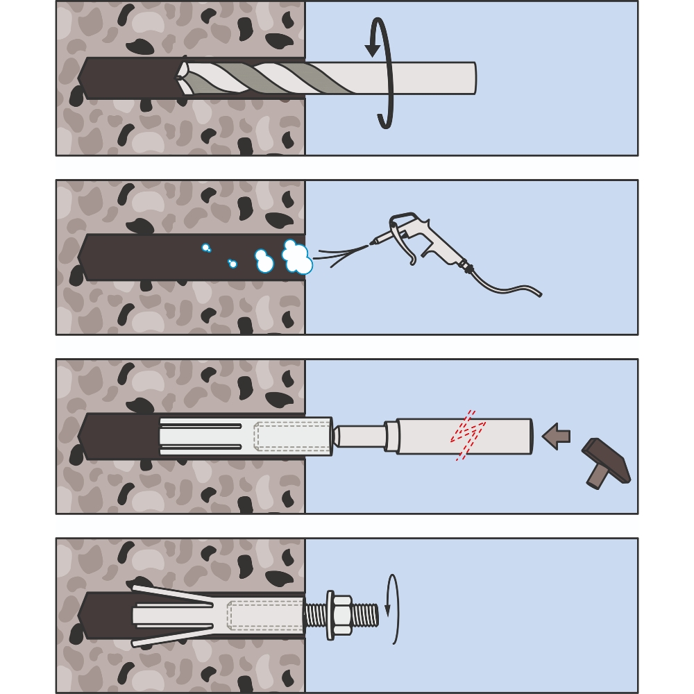 Inslaganker met metrische binnendraad is ideaal voor het bevestigen van bouten en draadeinden. Dit type anker is bijzonder geschikt voor tijdelijke bevestigingen, doordat de huls vlak met het oppervlak aansluit en niet uitsteekt. De M12-inslagankers worden geleverd in verpakkingen van 50 stuks. Toepassing - Geschikt voor voorsteekmontage. - Sla het anker in het boorgat met een hamer. Gebruik vervolgens de bijpassende inslagpen om de conus in het anker te slaan, zodat de huls zich volledig kan uitzetten. - Zorg ervoor dat de inslagpen volledig aansluit op de rand van het anker voor een optimale spreiding en verankering.