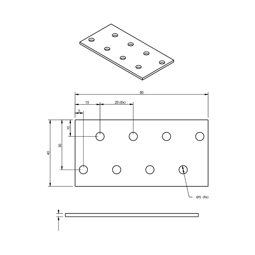 Kleine verzinkte plaat van 40x80 mm, ontworpen voor lichte koppelingen. De 40 x 80 mm uitvoering is geschikt voor zwaardere verbindingen en constructief houtwerk waar meer verankering in het materiaal vereist is.