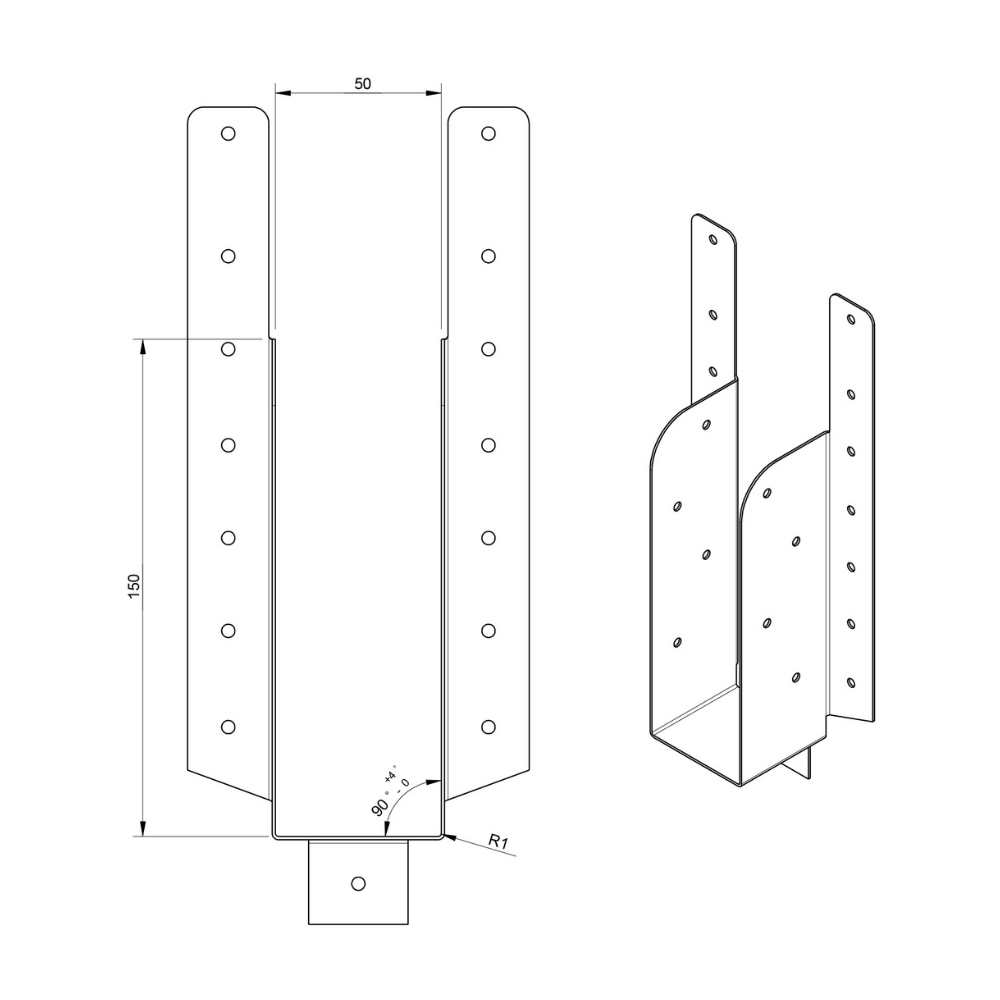 Brede raveeldrager met strip van 225x50 mm, geschikt voor stevige constructies. De langere 50 x 150 mm variant is bestemd voor constructieve toepassingen en het verbinden van dikke houtpakketten waar maximale uittrekweerstand essentieel is.