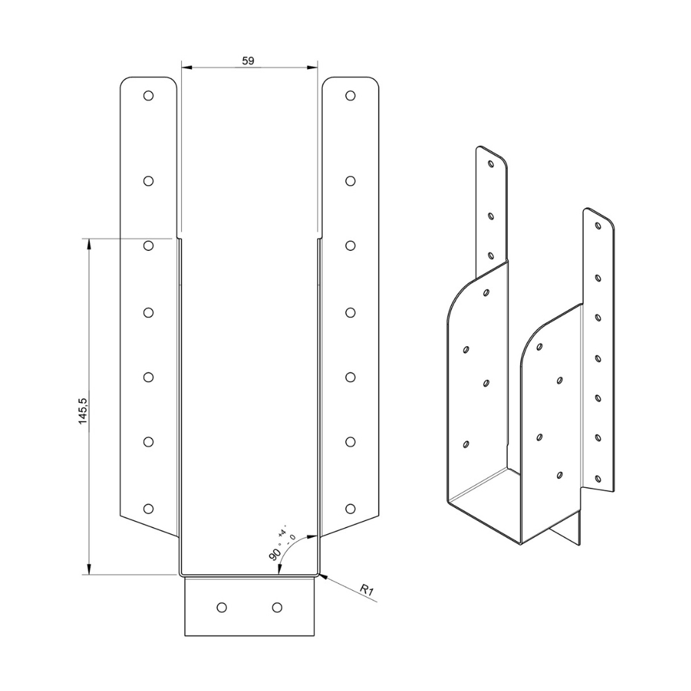 Robuuste raveeldrager met strip van 225x59 mm, ideaal voor zwaardere belasting. De langere 59 x 145 mm variant is bestemd voor constructieve toepassingen en het verbinden van dikke houtpakketten waar maximale uittrekweerstand essentieel is.