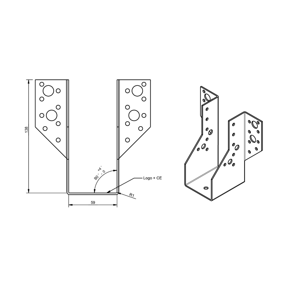 Raveeldrager van 335x59 mm, ontworpen voor stevige verbindingen. De langere 59 x 138 mm variant is bestemd voor constructieve toepassingen en het verbinden van dikke houtpakketten waar maximale uittrekweerstand essentieel is.