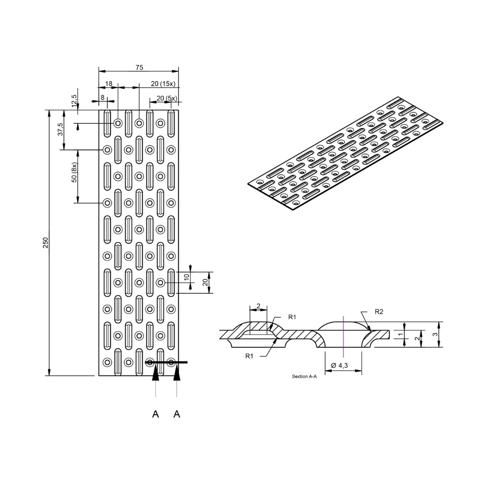 Verzinkte spijkerplaat van 75x250 mm, geschikt voor stevige houtverbindingen. De langere 75 x 250 mm variant is bestemd voor constructieve toepassingen en het verbinden van dikke houtpakketten waar maximale uittrekweerstand essentieel is.
