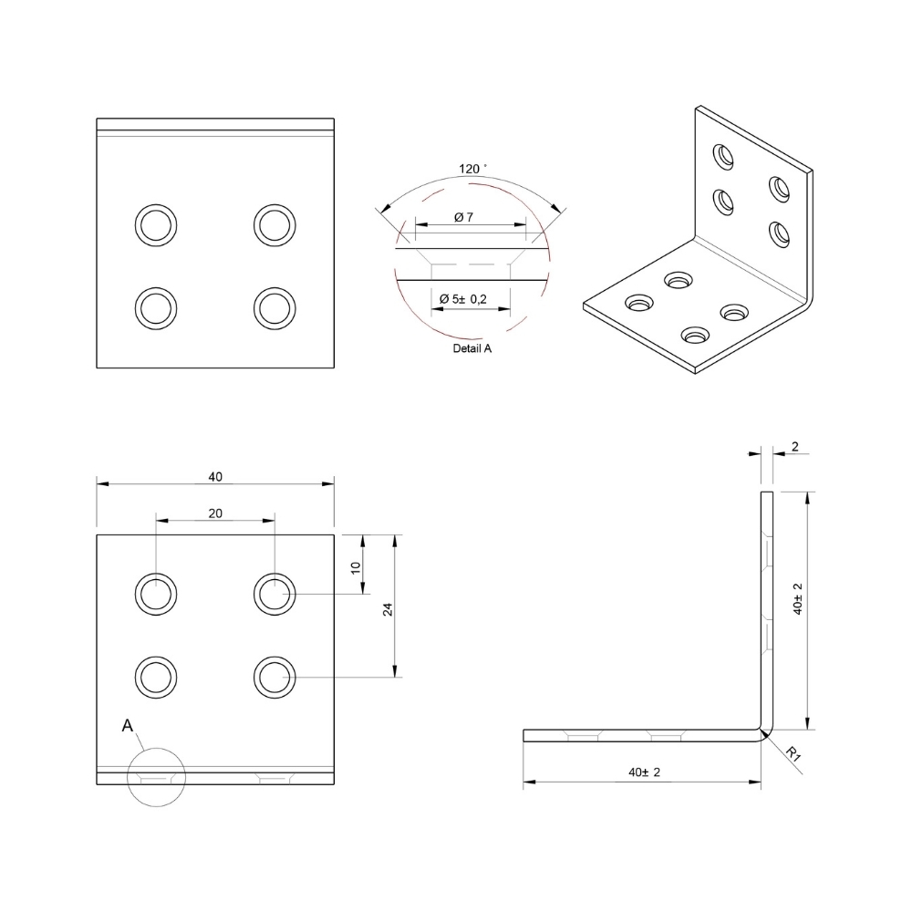 Versterkingshoek van 40x40x40 mm met verzinkte afwerking, geleverd in sets van vier. De veelzijdige 40 x 40 mm maat is een populaire keuze voor algemeen montagewerk, het bevestigen van platen en lichte houtverbindingen.